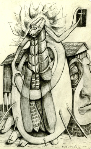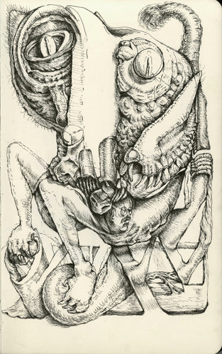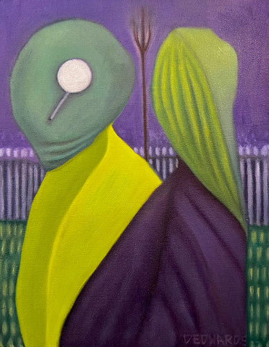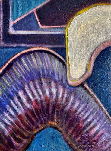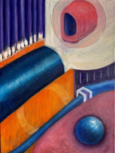 As evidenced by the work on display here, I’m more with Bohr. Each time I start a new work, I bring to it an open mind and no preconceived notion of where the finished piece will end up. I make stray marks and then react to them, striving to find balance while allowing my subconscious mind to dredge up imagery from my past or incorporating that which I see before me.